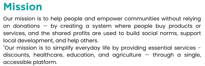 One app & card for everythingConnects users with authentic local businessesBuilds a self-sustaining system without donationsHelps people save money while boosting the local economyEmpowers individuals and entire communities